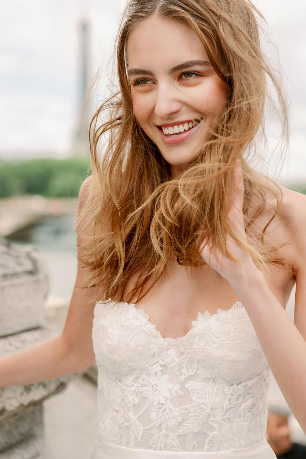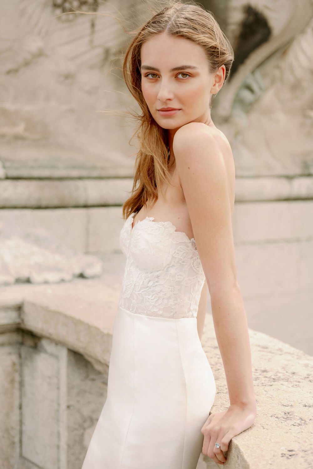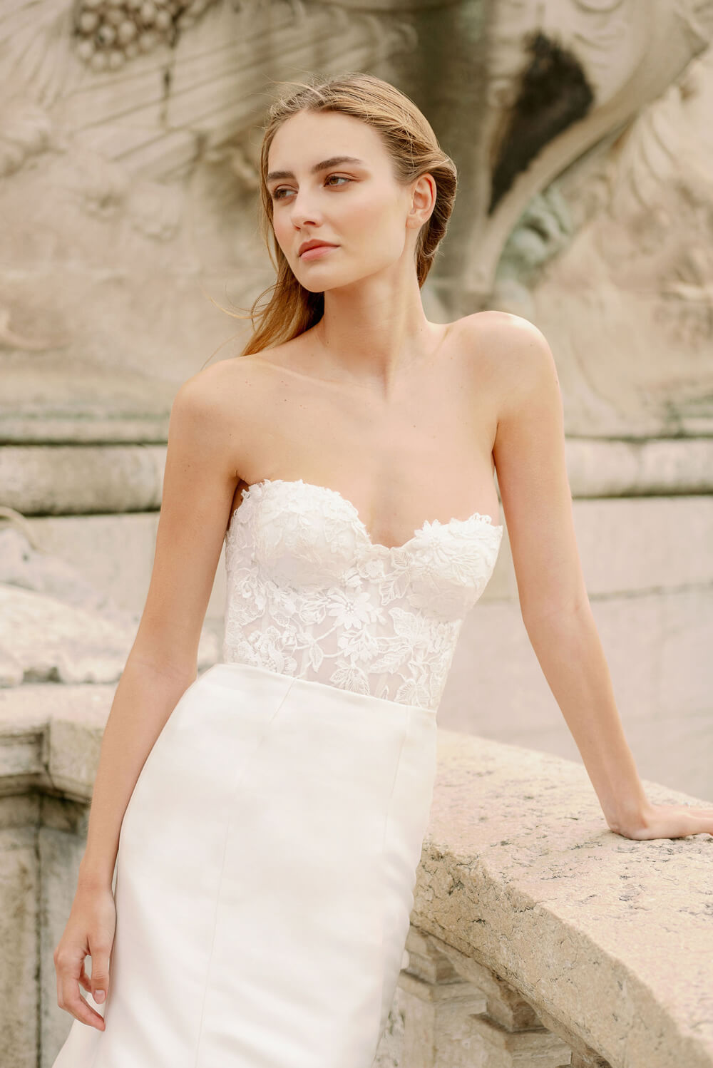 This dreamy wedding dress features a sleek and clean skirt and detailed bodice, for the bride who doesn’t want to choose just one! Exposed corseting underneath the delicate lace of the bodice adds a daring touch, as well!