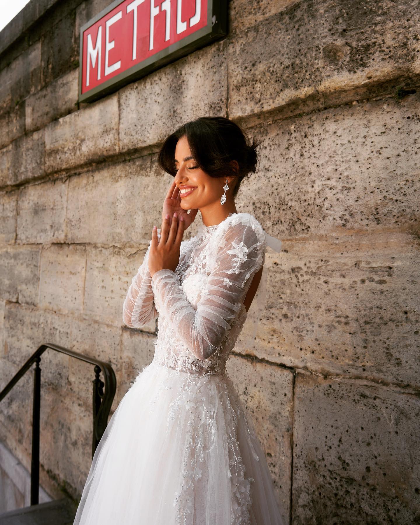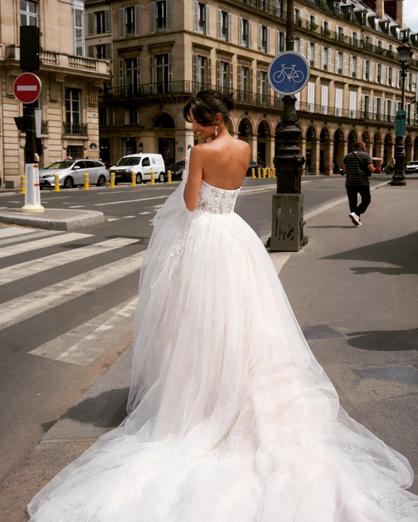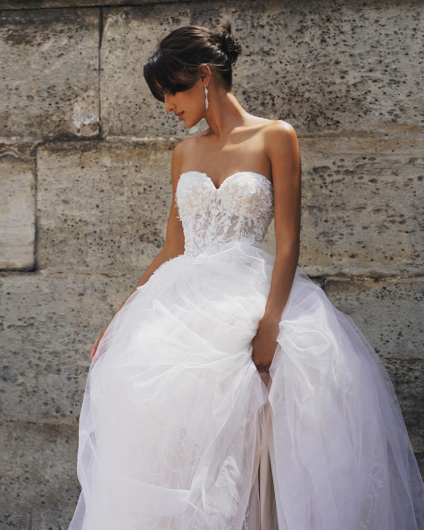 Princess dress, made of mesh tulle and a sparkling fabric. Top is a heart shaped corset with lace and a beaded appliqué. Accessorized with a small bolero with draped sleeves made of tulle, that can be worn open in the front or in the back.