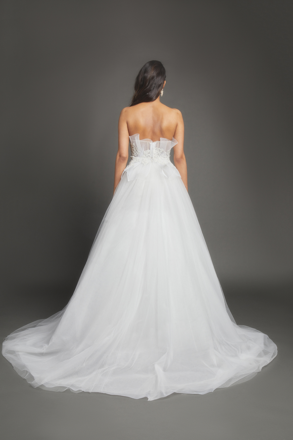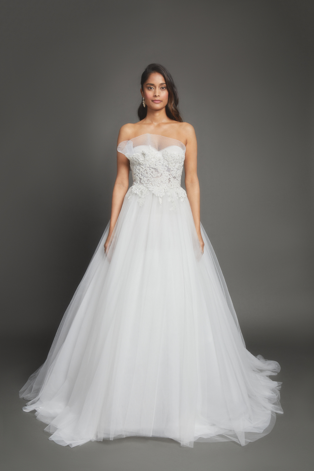 Features a strapless, sweetheart neckline that beautifully frames the shoulders and collarbone. The intricately embroidered bodice is adorned with delicate floral appliques, adding a touch of sophistication and style.