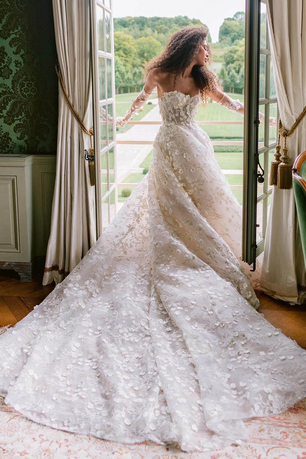 Breathtaking 3D floral embroidered tulle strapless corset bodice gown with a full ball gown skirt.